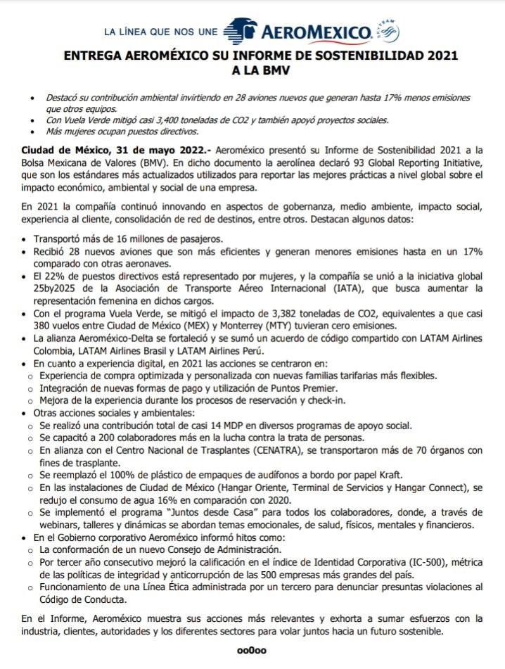 Aeroméxico presentó su informe de sostenibilidad 2021 a la BMV Mercados. La aerolínea declaró 93 Global Reporting Initiative, que son los estándares... Read More
