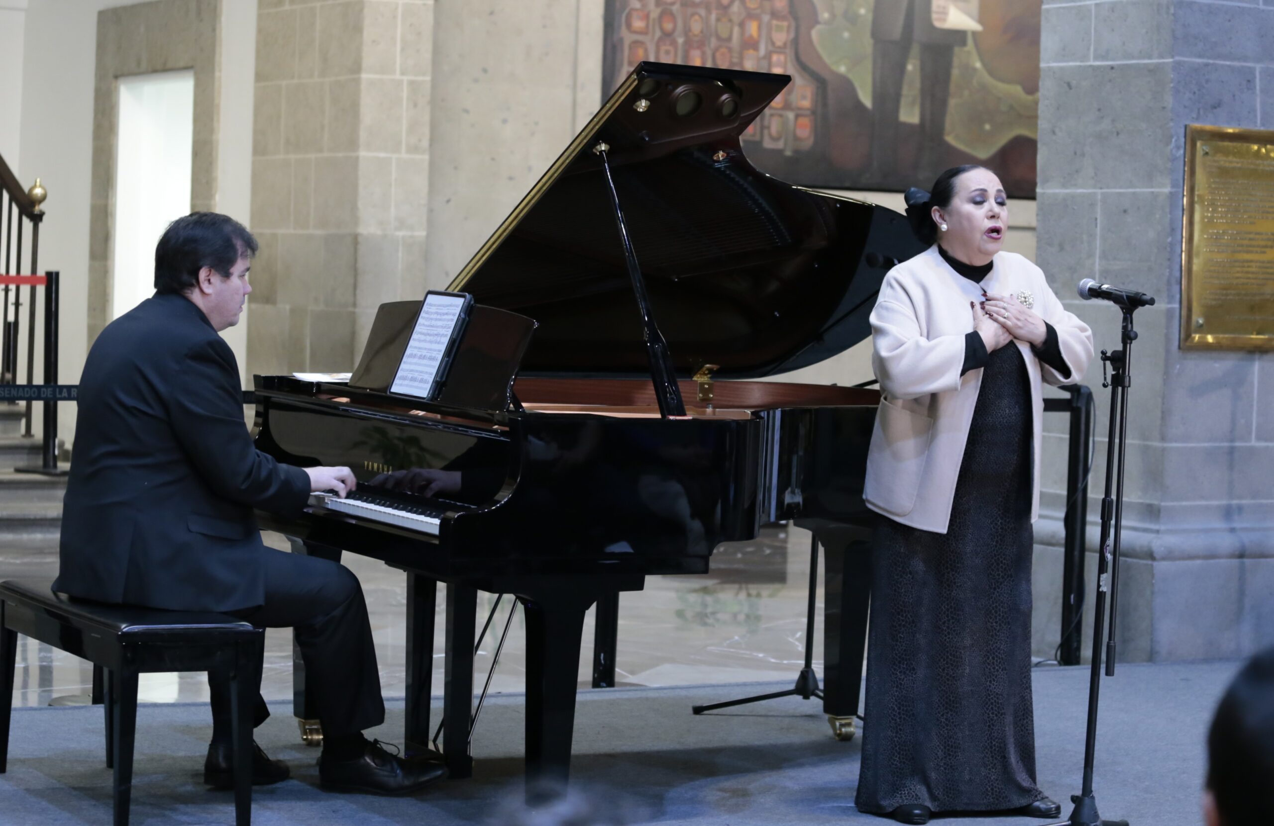 Los artistas invitados al recinto histórico de la Cámara de Senadores, el viernes por la noche, fueron la contralto, Ana Caridad Acosta, cantante solista de Bellas Artes, y el pianista Santiago Piñeirúa, concertista de Bellas Artes.