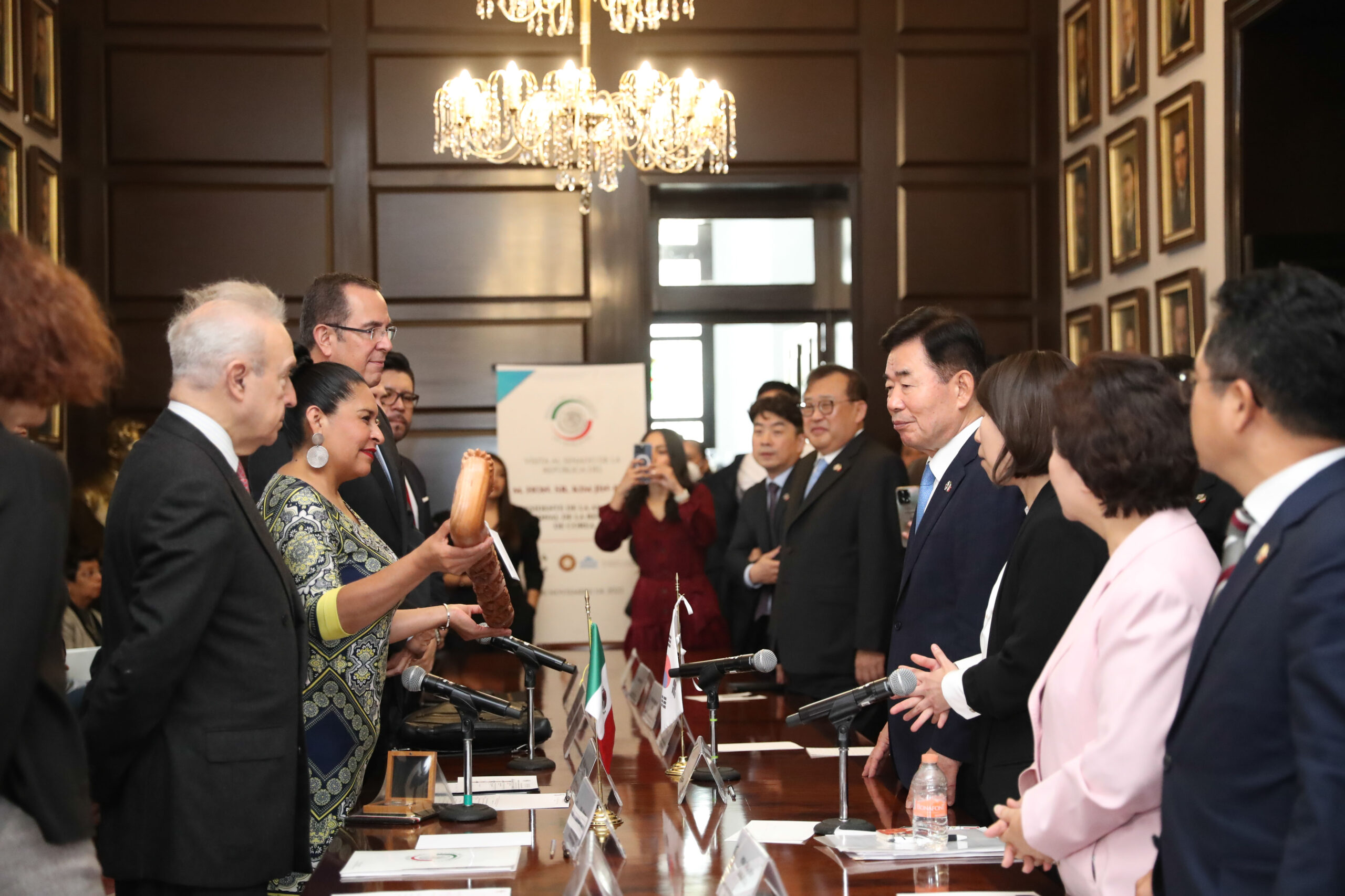 Previo al inicio del encuentro, Ana Lilia Rivera y Kim Jin-pyo depositaron una ofrenda floral en honor a Belisario Domínguez. Y al finalizar el presidente de la Asamblea Nacional de la República de Corea firmó el Libro de Visitantes Distinguidos del Senado de la República.