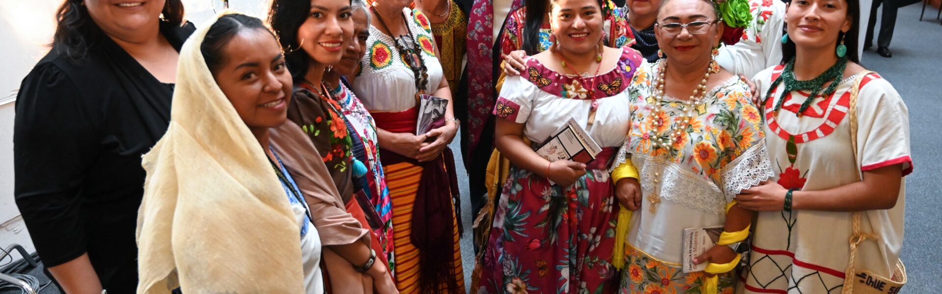 En la conferencia matutina, leyeron la Cartilla de los Derechos de las Mujeres, que ha sido traducida a 35 lenguas originarias: Angélica González Pinillos en náhuatl; Teresa de Jesús Ríos García en mazateco; Marisela González González en otomí; Jéssica Guadalupe Espicio Sebastián en p’urhépecha; Lucía Eugenio Bibiano en popoluca; María del Carmen Álvarez Juárez en chichimeco; María Arcelia Rodríguez Torres en yokot´an; Agustina del Carmen Tah Pech en maya y Dulce Belem Romero Castillo en yaqui.