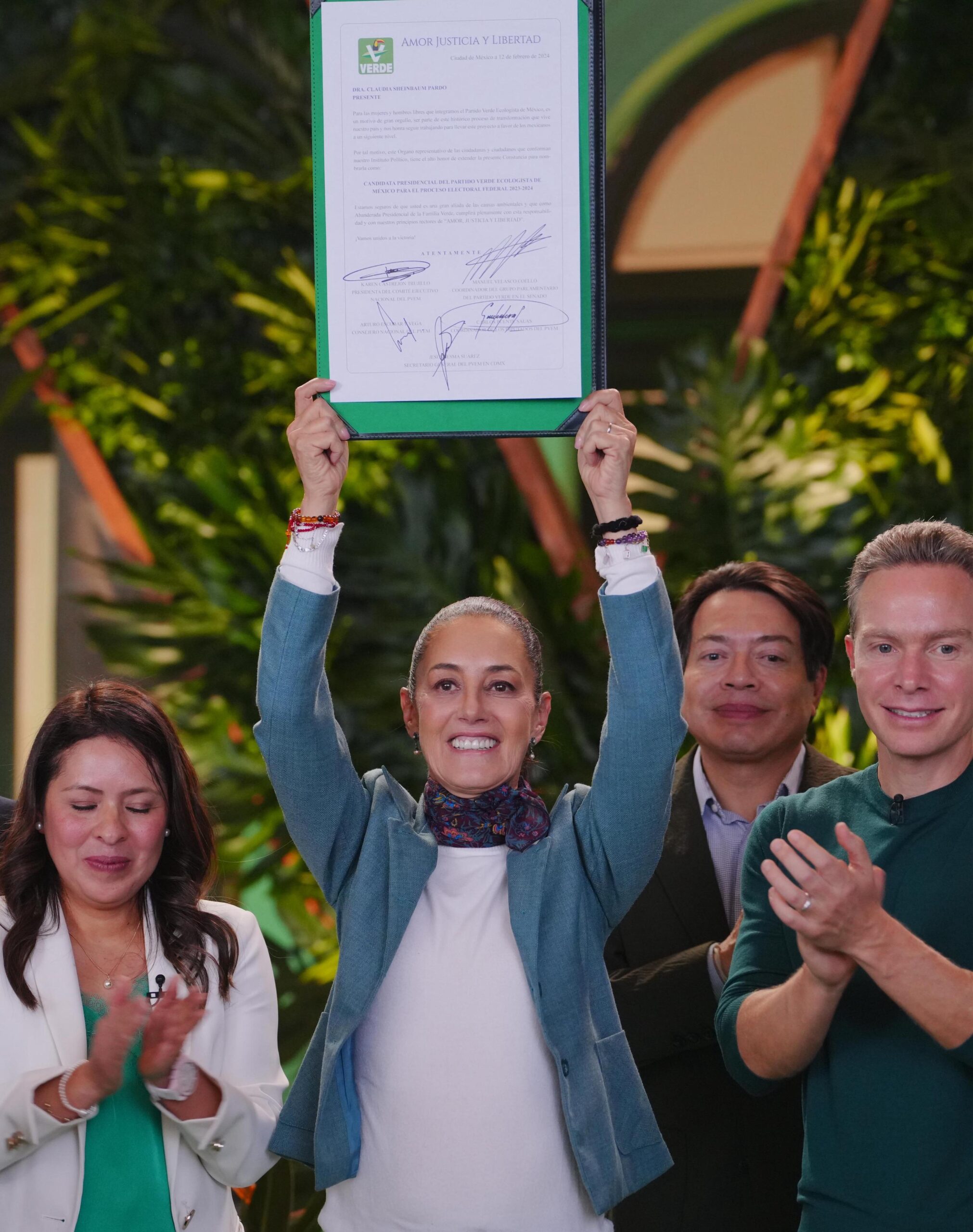 Claudia Sheinbaum Pardo recibió formalmente la constancia como candidata del Partido Verde Ecologista de México (PVEM) a la Presidencia de México, como parte de la coalición “Sigamos Haciendo Historia” que también integra Morena y el Partido del Trabajo (PT), tras reconocerla como una mujer ambientalista que pondrá en el centro la protección y cuidado del planeta durante la construcción del segundo piso de la transformación.