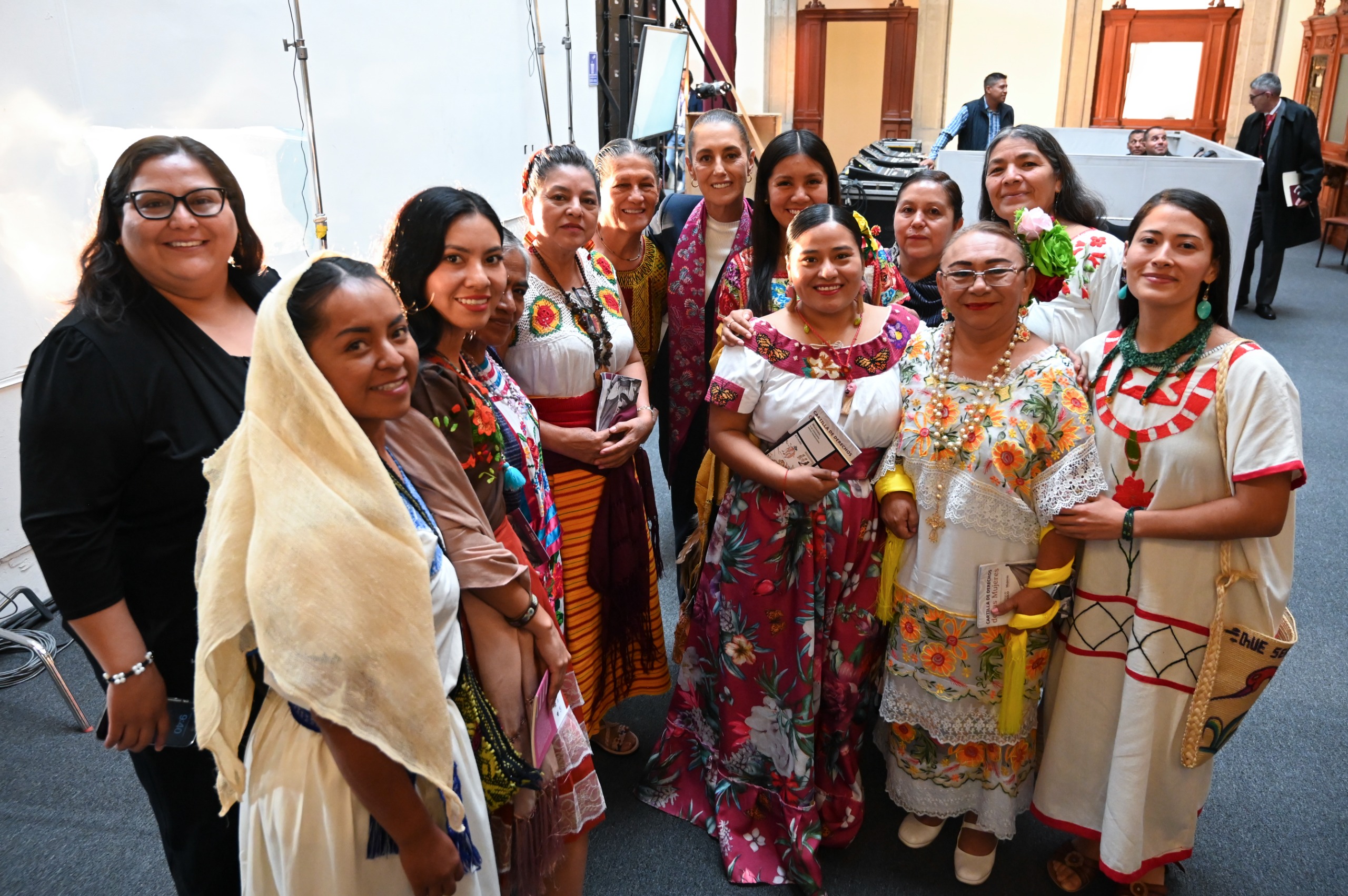 En la conferencia matutina, leyeron la Cartilla de los Derechos de las Mujeres, que ha sido traducida a 35 lenguas originarias: Angélica González Pinillos en náhuatl; Teresa de Jesús Ríos García en mazateco; Marisela González González en otomí; Jéssica Guadalupe Espicio Sebastián en p’urhépecha; Lucía Eugenio Bibiano en popoluca; María del Carmen Álvarez Juárez en chichimeco; María Arcelia Rodríguez Torres en yokot´an; Agustina del Carmen Tah Pech en maya y Dulce Belem Romero Castillo en yaqui.