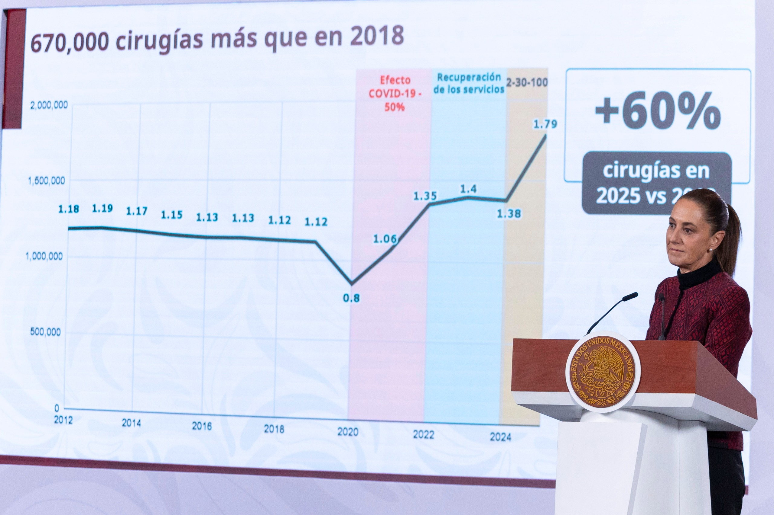 Explicó que, actualmente se realizan 60 por ciento más cirugías que en 2018, es decir 670 mil cirugías adicionales. En el caso de las consultas de especialidad, se incrementó en cerca de 10 millones más que en 2018, es decir un incremento del 48 por ciento; en consultas de medicina interna, 18.3 millones más que en 2018, lo que representa 21 por ciento más. Anunció que, para 2026 la meta es realizar 2.15 millones de cirugías, 32 millones de consultas de especialidad y 108 millones de Medicina Familiar.