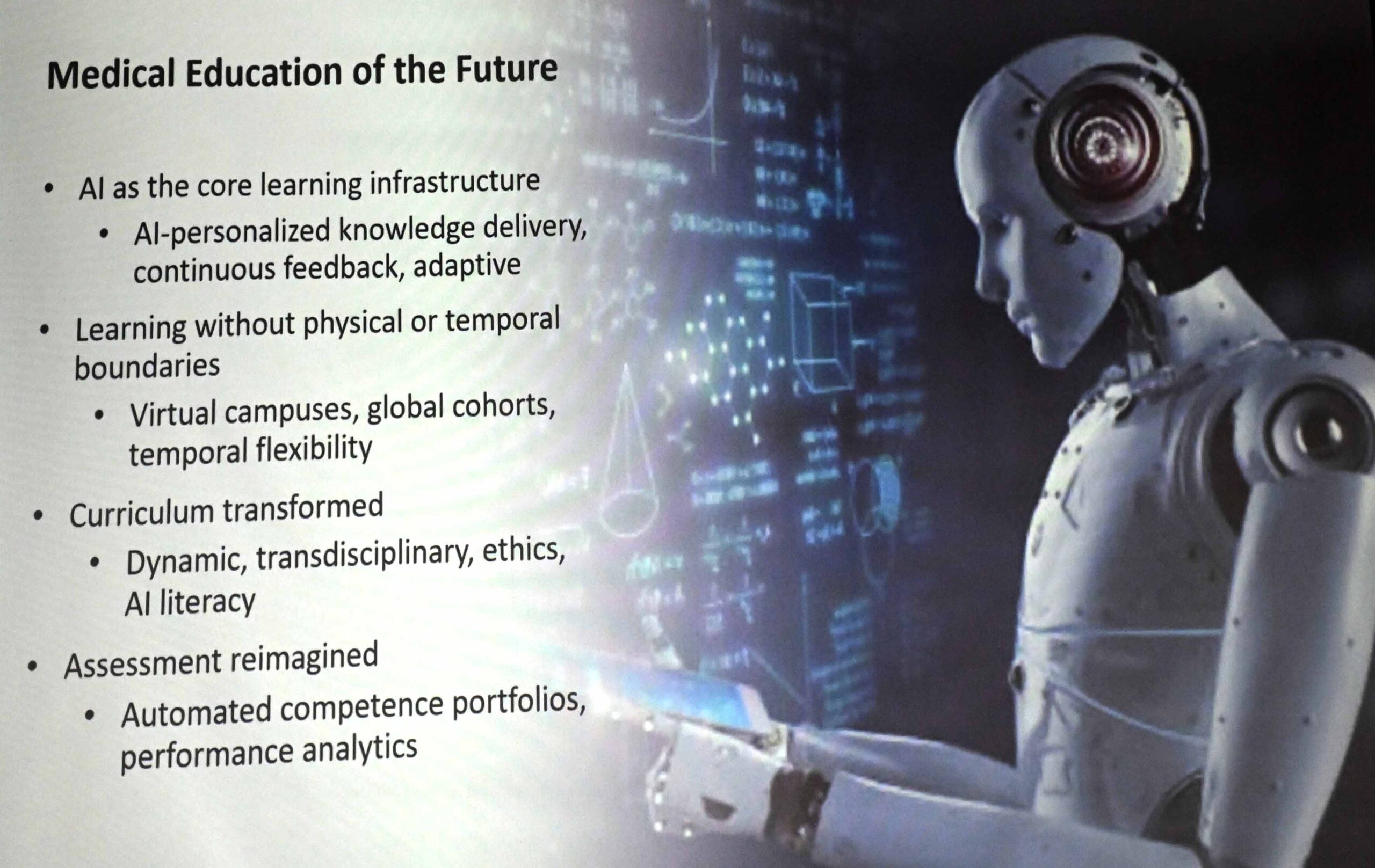 La enseñanza médica del futuro, manifestó, integra nuevas herramientas como animación, realidad aumentada, simulaciones virtuales, módulos de aprendizaje en línea, elaboración de videos cortos, laboratorios de simulación y diseño de juegos educativos.