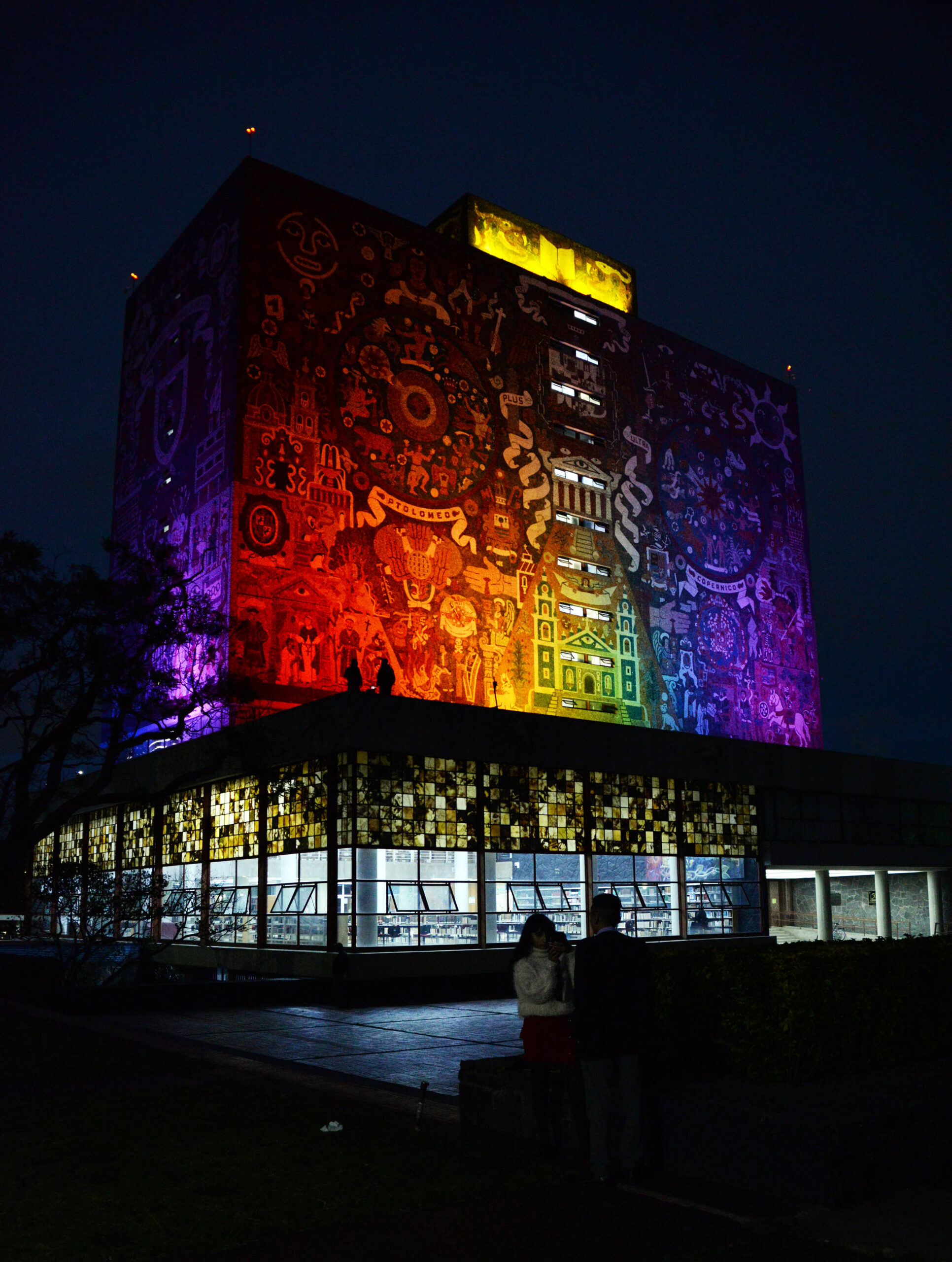 Hoy, 21 de junio, a partir de las 19:30 horas se iluminó el edificio de la Biblioteca Central de la Ciudad Universitaria con los colores de la bandera LGBTIQ+.
